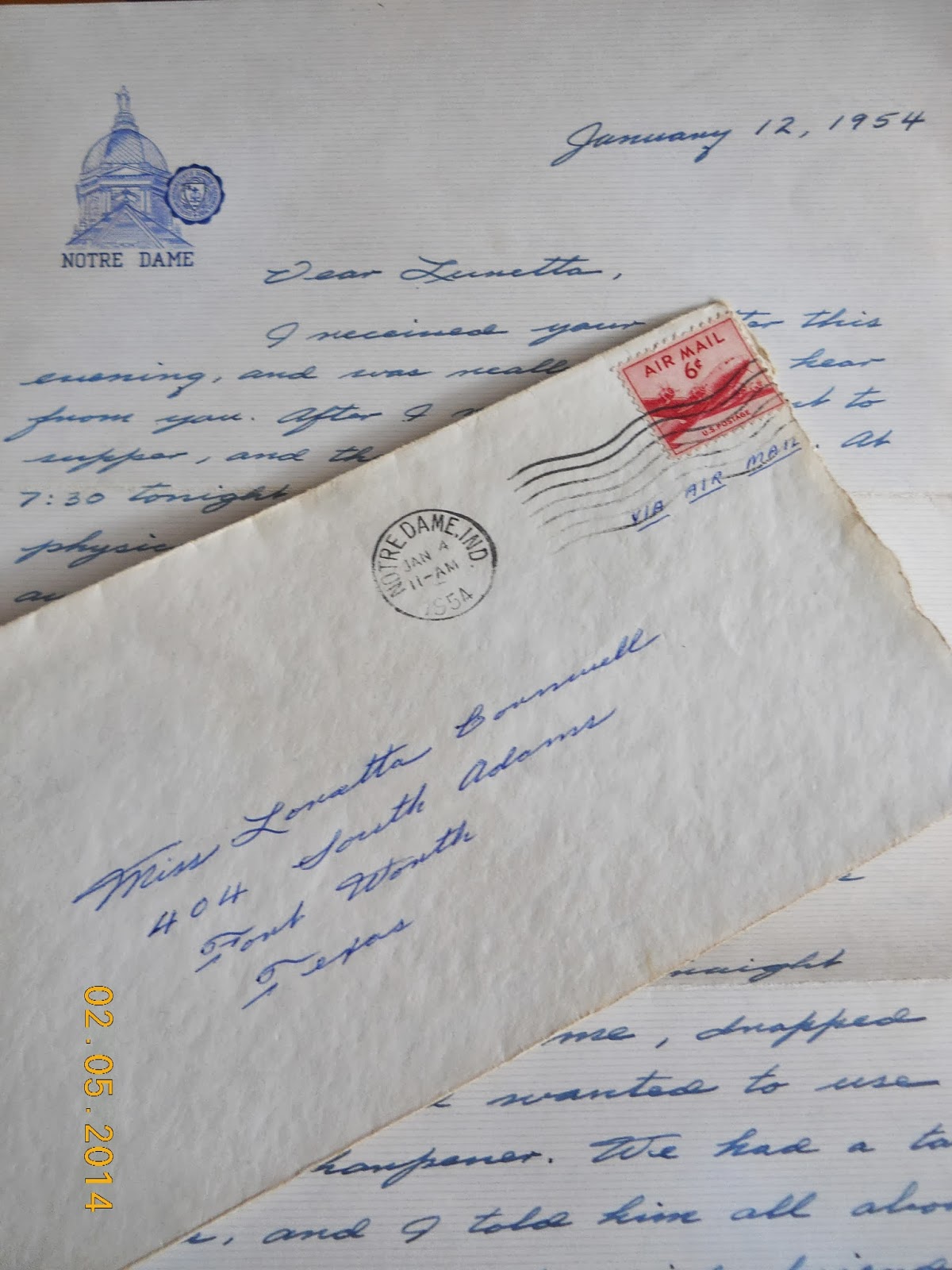 After that letter, there are no more because my dad convinced his parents to let him attend TCU in Fort Worth and he never returned to Notre Dame. Mom and dad dated for two more years and were married on April 26th, 1957. They were married 44 years until my dad passed away from cancer.