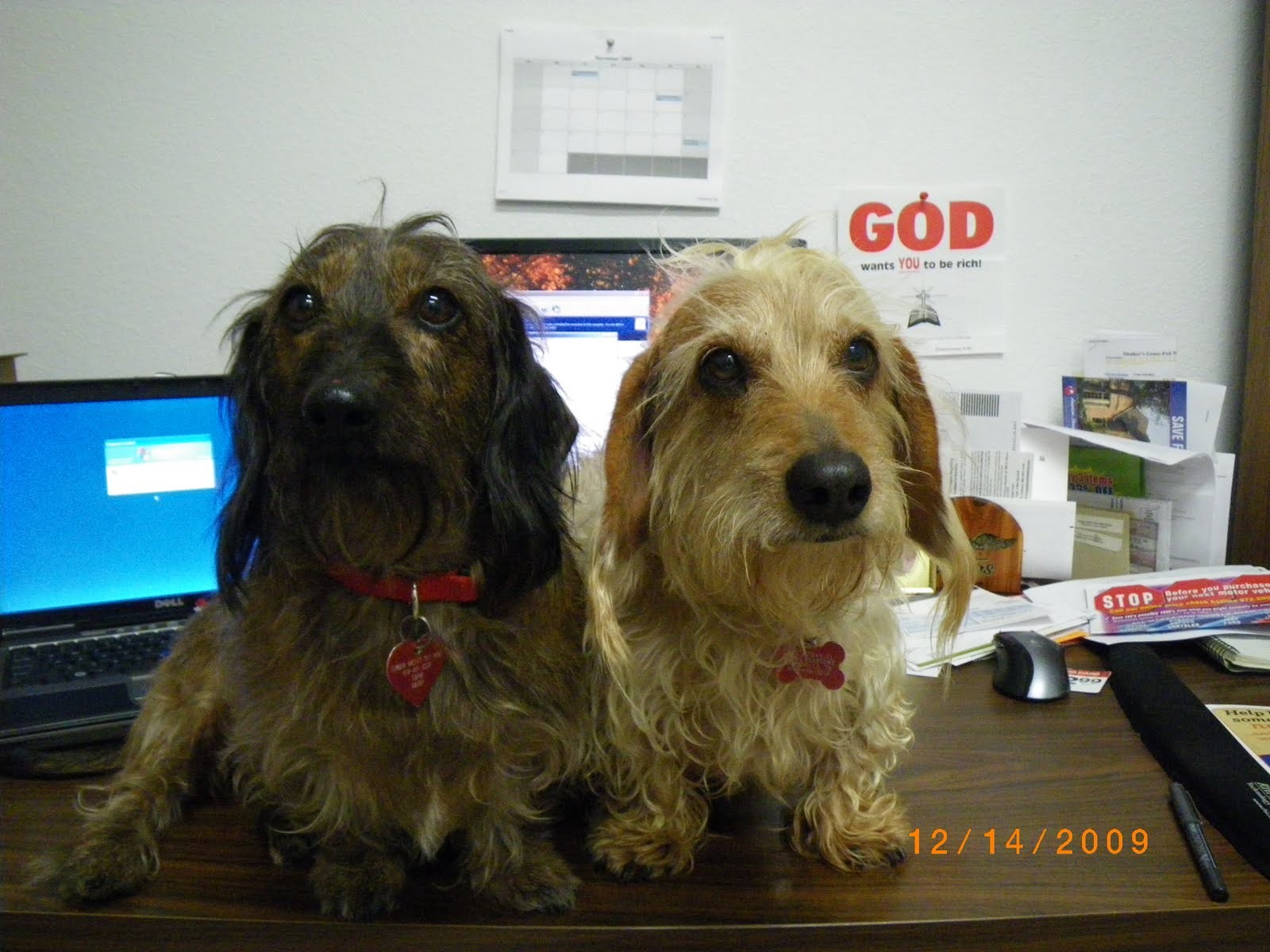 We have two dachshunds that we just love to pieces. Our little male Putz would lick you to death and is a cuddler. He has to be in the same room you’re in or right up next to you if you’re on the couch. He's always close. (Putz is the light brown long haired and Ashley is the dark wire haired dachshunds. They like to sit on my husband's desk while he works.)Ashley, our little female dachshund, is head dog. The toys are all hers, both dog beds are hers, the food is all hers and yet she loves Putz. She will bite him on the ear and pull him in the direction she wants him to go. She’s the fierce protector and barks at anything that moves or sometimes doesn’t move. Yet she’s afraid of everything. She will be barking one moment and cowering under the bed the next.