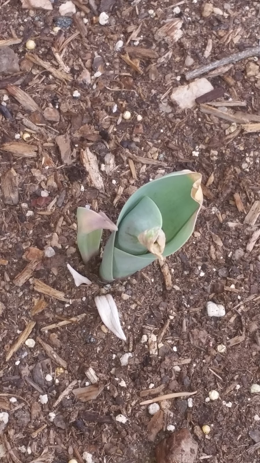 What my garden actually looks likeAlthough they did try valiantly to hold on to life and might even have come back, if it weren't for an Arctic front that dropped the temps below 0.Okay, lesson learned, no pretty flowers. Disappointed, I decided to try again and planted a whole box of daffodils and tulips. Six tulips attempted to come up. They don't look so hot, eh?