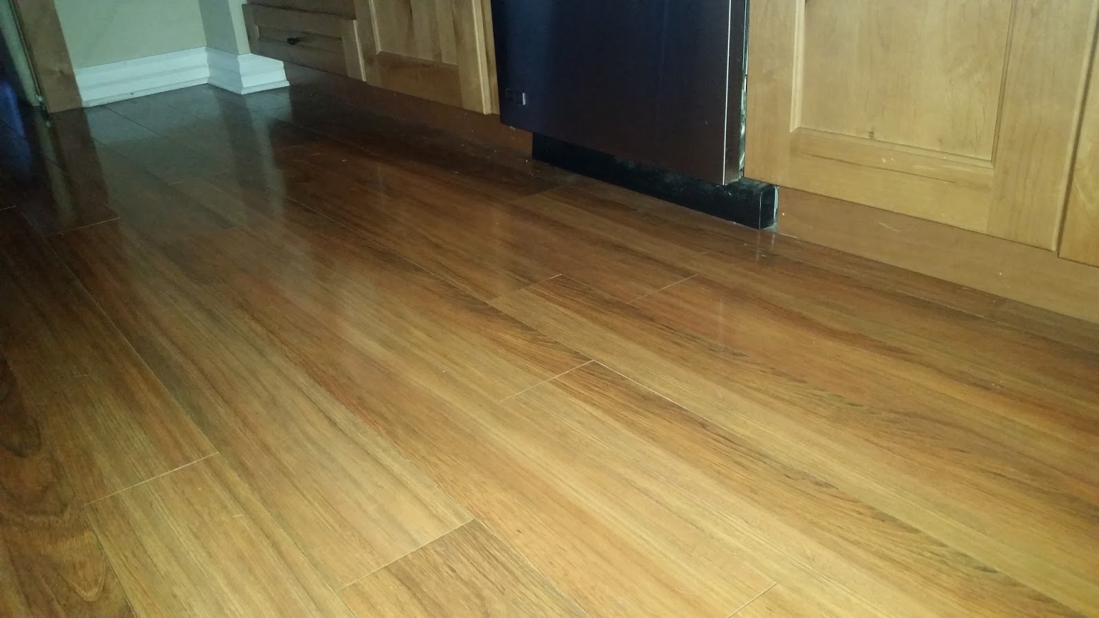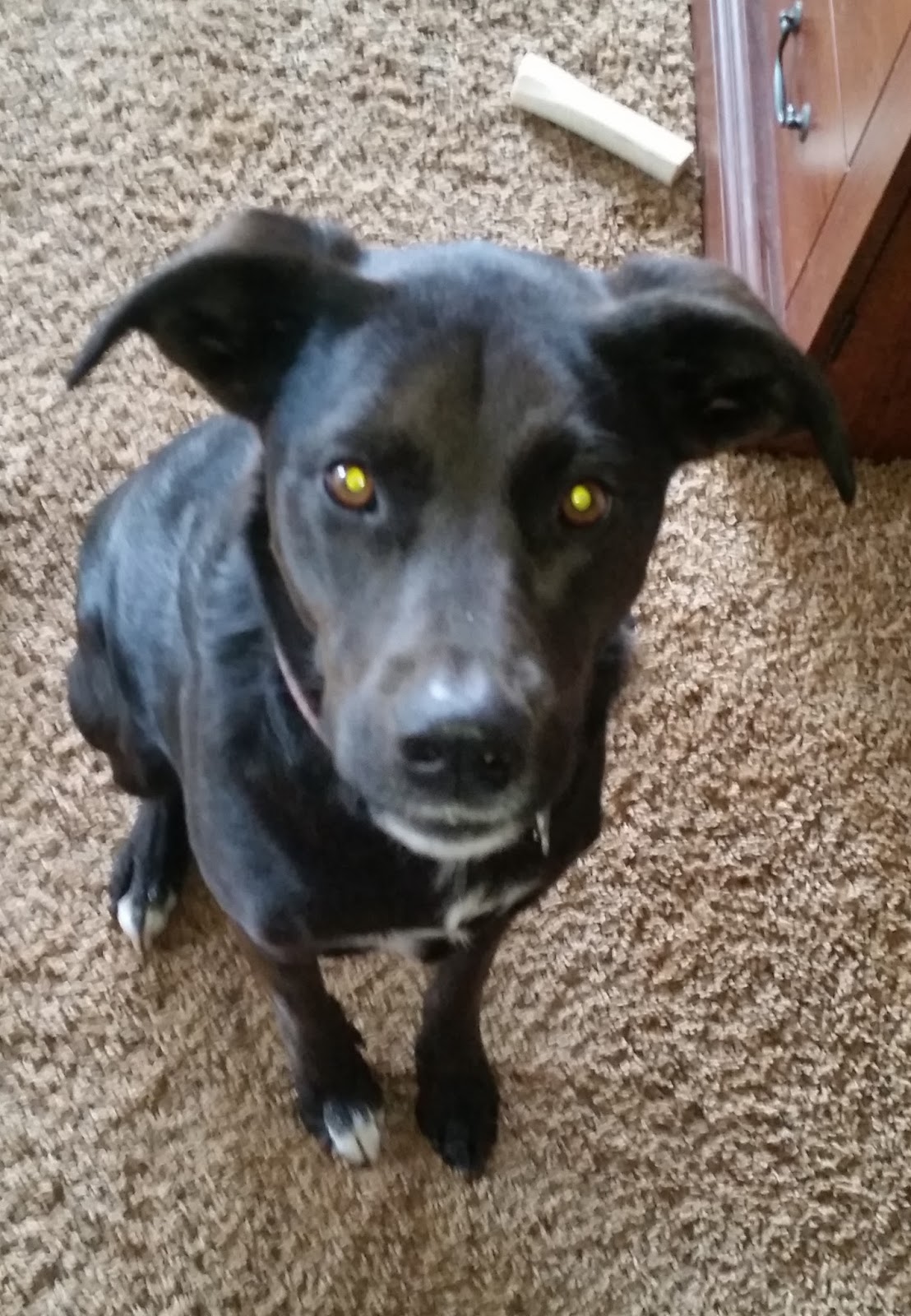 Here's what happened: We put The Kraken on a leash in the carpeted bedroom where she frolics and plays like normal. We lead her to the bedroom door where the laminate starts. We step onto the floor only to almost fall on our faces since she has stopped in the middle of the bedroom, nails poked through the carpet, securing herself to the floor. She is not moving even if a hurricane blew through the room. She gives us a look like we are addled if we think she's taking one step out that door. Ignoring that look (along with the one that tells us of an extremely hot place we can visit), we pick ourselves up off the floor, circle around and try again. This time she's on to us and as soon as we aim for the bedroom door she has once again attached herself to the carpet. After a few more tries of this, we decide she can just be afraid of the floors.