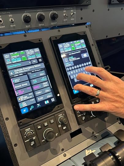 In this initial application, the flight deck consists of a three-screen set of large 14-inch primary flight displays (PDUs), and two smaller (7-inch) portrait-oriented secondary displays (or SDUs). But rather than having data entry only available on the SDUs (they are positioned similarly to the touchscreen controllers in the G3000), the pilot can enter data there or directly on the PDU. Fields available for data entry are highlighted, and the pilot can swipe down menus from the top bar to edit those fields directly—I almost applauded when I saw that, thinking back on how frustrating it can be when you get in an airplane and those aren’t to your liking.