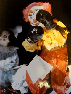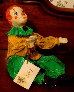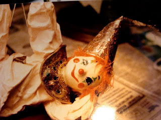It's about the papier-mâché clowns I used to make. Most of them became lamps, and they all found homes. Papier-mâché means chewed paper, but I wasn't that authentic. They were entirely handmade though. I made coat-hanger frames, tore newspaper into small pieces, and soaked it in a mixture of flour, water, and Elmer's glue. Each clown took close to 40 hours to make one, counting the drying time. the clothes were paper too. The oven was always on and steaming. Definitely a winter event. But it was fun. It did destroy the kitchen while I was doing it though. I can't even write on a computer and be neat. My kitchen table was under this mess for weeks at a time.