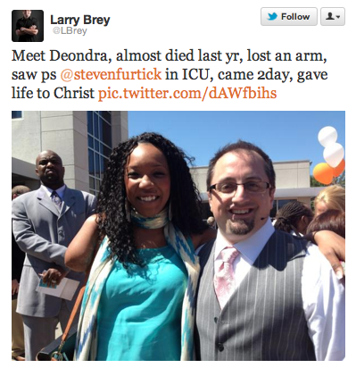 Larry Brey, our University Campus Pastor, shared the story on twitter of Deondra, who almost lost her life last year, saw Pastor Steven in the ICU, decided to come to Elevation for Easter, and gave her life to Christ.