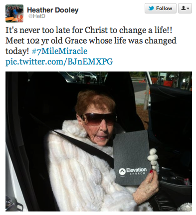And finally, proving that it's never too late for Christ to change a life, Heather Dooley, the wife of our Blakeney Associate Campus Pastor, Nick, tweeted this photo of Grace, who gave her life to Jesus this weekend at 102 years old.