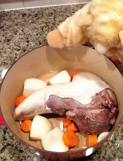 You start by simmering the tongue in water for five minutes, then rinsing it in cold water. The blanched tongue then goes into a heavy pot with a chopped carrot and a quartered onion (the white thing that looks like an upside-down slipper is the skin after the initial blanching):