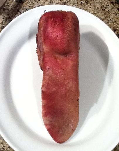 …or actually, a big tongue, about four pounds. Last night's cooking experiment was "Tongue with Madeira Sauce," from James Peterson's Meat: A Kitchen Education.