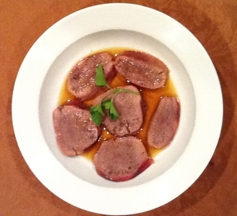 This goes uncovered into a 400°F oven for an hour. Then a braising liquid of chicken or beef broth and Madeira is added, along with a bouquet garni, and the pot is covered and left to simmer over a low flame for another two hours. The tongue then comes out of the braising liquid and the skin—which is very loose at this point—is removed and discarded. The braising liquid is strained, skimmed of fat, and reduced by about half. Finally the tongue and the reduced braising liquid go back into the pot and into the oven for another half hour at 400°F, basting every ten minutes.