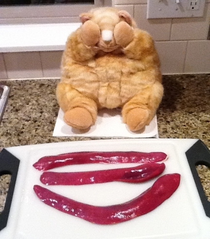 You're supposed to let them cool before you slice them, but I jumped the gun and started cutting while they were still warm, which loosened the roll and led to the unfortunate turd-like appearance you see here. As for the flavor and texture, it's kind of like chewy liverwurst. There's also a weird aftertaste—I thought it might be the sage, but after sampling the leftovers this morning I'm pretty sure it's the spleen itself.