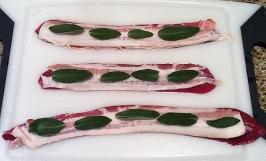 For a recipe I turned to Fergus Henderson's The Whole Beast: Nose to Tail Eating. His "Rolled Pig Spleen" has you layer bacon and sage on the spleens, like so: