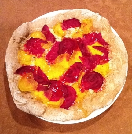 It's the "Rainbow Beet Pizza" from Jeff Hertzberg and Zoë François's Artisan Pizza and Flatbread in Five Minutes a Day: red and golden beets, sliced paper thin on a mandolin, placed over a layer of shredded cheddar cheese and drizzled with olive oil. The crust is the same spelt flour dough I used to make the Turkish pita boats.