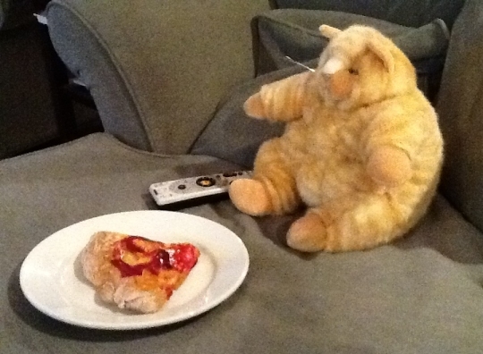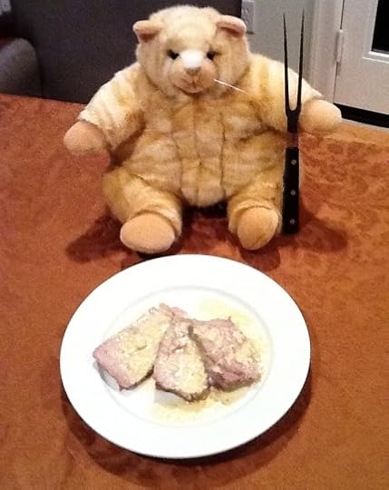 And below is the finished pork, topped with a bit of milk-garlic sauce. Unfortunately the photo, taken with my iPad2, makes it look like something out of a scary '50s cookbook; trust me, it's more appetizing than that. Iron Chef Kitteh couldn't wait to dive in: