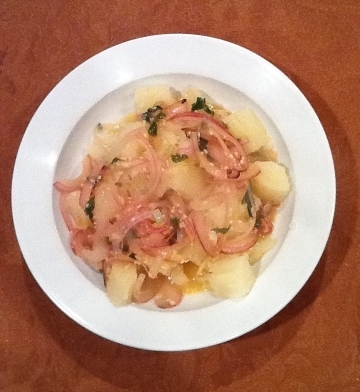 As for the cassava, my cousins had warned me that it's a bit of a pain to make from scratch (they buy theirs pre-peeled and frozen). You need to peel the outer skin with a knife and cut the root into chunks, removing the woody core. From there it's like boiling a really dense, starchy potato. Timing's a bit tricky, because different sized chunks cook at different speeds, and they start to disintegrate not long after they're done, but I was able to find a happy medium. Here's the finished cassava, topped with a Cuban-style sauce of red onion, garlic, parsley, and orange and lime juice: