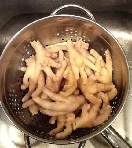 For a recipe I settled on "Spicy Steamed Chicken Feet" from Jennifer McLagan's Bones: Recipes, History, and Lore, in part because it was the only one I found that didn't require deep-frying, something I prefer not to do unless I'm sure the result is going to be worth the mess. Instead, after clipping the toenails, you give the feet a quick blanch in boiling water, which makes them curl up like little alien hands: