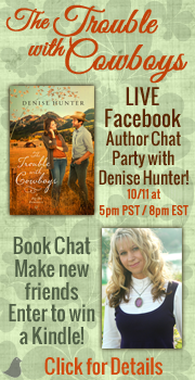 Grab your copy of Denise Hunter’s latest book and join her for an Author Chat Party on October 11th at 8:00 PM EST (that’s 7:00 Central, 6:00 MST, & 5:00 PST)! Haven’t read The Trouble with Cowboys yet? That’s okay, don’t let that stop you from coming to the party! (You may win a copy!)