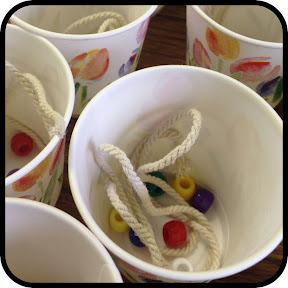 A Helpful Tip: I divided all the supplies into dixie cups, for a way to "presort" the items AND provide a simple way to pass out the supplies to a large number of children. Large group = short attention span. Passing out the beads in large bags would have been too confusing and taken WAY too long. The cups simplified the process.