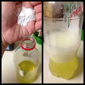 Next you add a bit of baking soda - which really does make the Mountain Dew "bubble up."