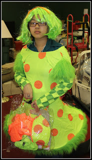 Oh, an explanation for the costume - the Salvation Army really wanted to have a "clown" type person to be at the outreach carnival tomorrow. They had been praying about it - and a costume was donated this week that would make it work.