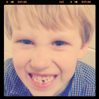 Spencer lost his first tooth - and it took me all day to get him to a) smile and b) show me his missing tooth.So seeing this photo on my phone on Monday,