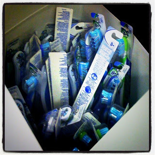 Getting ready for the mission trip. One of my friends, a dentist, provided tooth brushes for the mission trip.We're going to use them as "prayer joggers."We'll write the prayers on the brush (with sharpie)and then it is geared for the kids to think about theprayer request each time they brush.