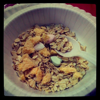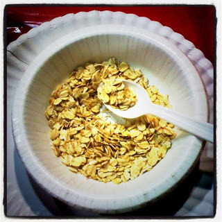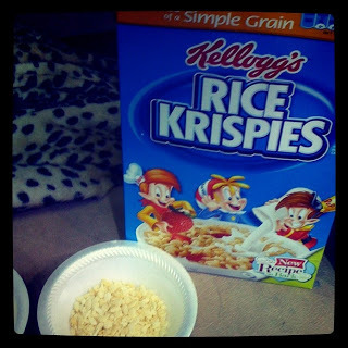 Fill the bottom of a bowl with oatmeal. Add a "pinch" of Rice Krispies (Oats are the "main" filler for this project.)