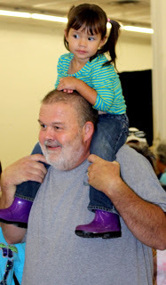 Averi Silverstone, 3, Cleora, gets a birds-eye view of REC Day on top of her grandpa's, Steven Copeland, shoulders.