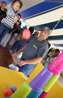 REC employee Gary Roger (center) watches as Sara Jane Mahurin, 4, tries to knock over cups during one of the children's games at REC Day, held Saturday, Sept. 19, in Grove.