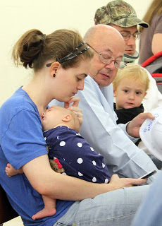 While 2-1/2-month-old McKenzie Beeson of Ketchum sleeps in her mother's arms, the rest of her family (from left) Alex Beeson, Richard Newman, Matthew Beeson, 2-1/2, and Jerry Beeson prepare for the start of the 2015 REC Day cooperative meeting on Saturday, Sept. 19, at the Grove Civic Center.