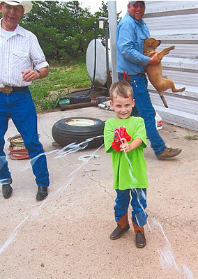 It's also one of my favorites, because of the pure joy on his face and on my dad's face (left corner). I just happened to snap it - I think I was walking away and Collin yelled for me to turn around - and zap, he got me! (Teach me to buy a messy present.)