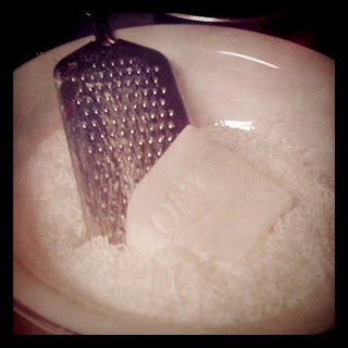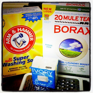 So when I found myself staring at the laundry soap today at the store - and being frustrated at a) the price and b) the scents (it seems I've become a bit extra sensitive to some of the smells), I thought, "I have extra time, why not try Rebecca's recipe."