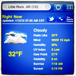 Taking Note Of The Weather: Canadian winds I guess - brought snow to NWA and cold weather to Little Rock. Made it hard to get out of bed and the warm covers today.