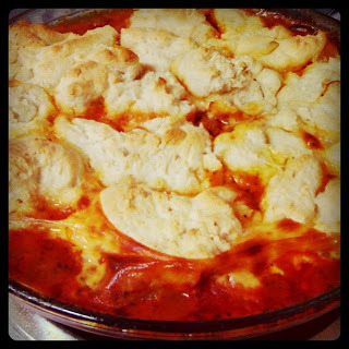 So I poured the meat and sauce into the bottom of a pie pan, added a layer of mozzarella slices (not sure why they had me buy slices, instead of shredded cheese, and then "dropped" the dough on top like biscuits.