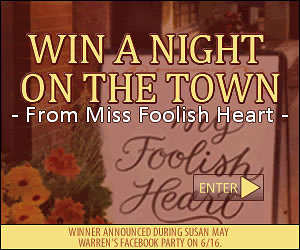 To celebrate this charming novel about a dating expert who's never had a date, Susan has put together a romantic night on the town for one lucky couple. One grand prize winner will receive a Miss Foolish Heart prize package worth over $200!