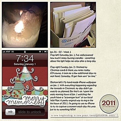 I'm going to try (no promises) to make a simple layout each week, highlighting these photos and and a brief bit of journaling. Again, I know this won't be perfect - but that's the lesson for the first few days of 2011 - imperfection is ok. My week is going to run Monday to Sunday - so I can reflect on the week on Sunday.