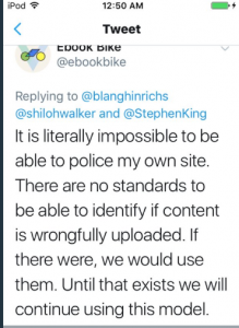 So there has been a lot of hullaboo about the site Ebook Bike and its operator Travis McCrea. In case you haven’t been following the blowout, EBook Bike allows people to upload content to the site, which McCrea does not moderate (as you can see in his statement here):