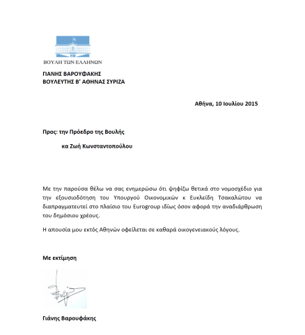 «Με την παρούσα θέλω να σας ενημερώσω ότι ψηφίζω θετικά στο νομοσχέδιο για την εξουσιοδότηση του Υπουργού Οικονομικών κ Ευκλείδη Τσακαλώτου να διαπραγματευτεί στο πλαίσιο του Eurogroup ιδίως όσον αφορά την αναδιάρθρωση του δημόσιου χρέους. Η απουσία μου εκτός Αθηνών οφείλεται σε καθαρά οικογενειακούς λόγους.»