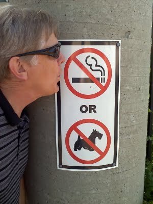 Steve's antics aside, take a look at the bottom "no" designation. No Scottish Terriers. Evidently greyhounds are allowed, as are small fluffy dogs and beagles. I'd never seen a "No Dogs" picture highlight a specific breed. Did the sign's creator hate Scotties? Or love them?I'm still looking for the "Scotties Only" water fountain.