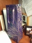 This one is really nice. It's made of a high-cotton-count paper with sparklies on the peacock feathers. Think of how many of these are given out in the average evening throughout America. They add nothing to the sentiments behind the gift. They clutter one's house. They suck up resources. Most of them are ugly (although this one's kinda pretty).