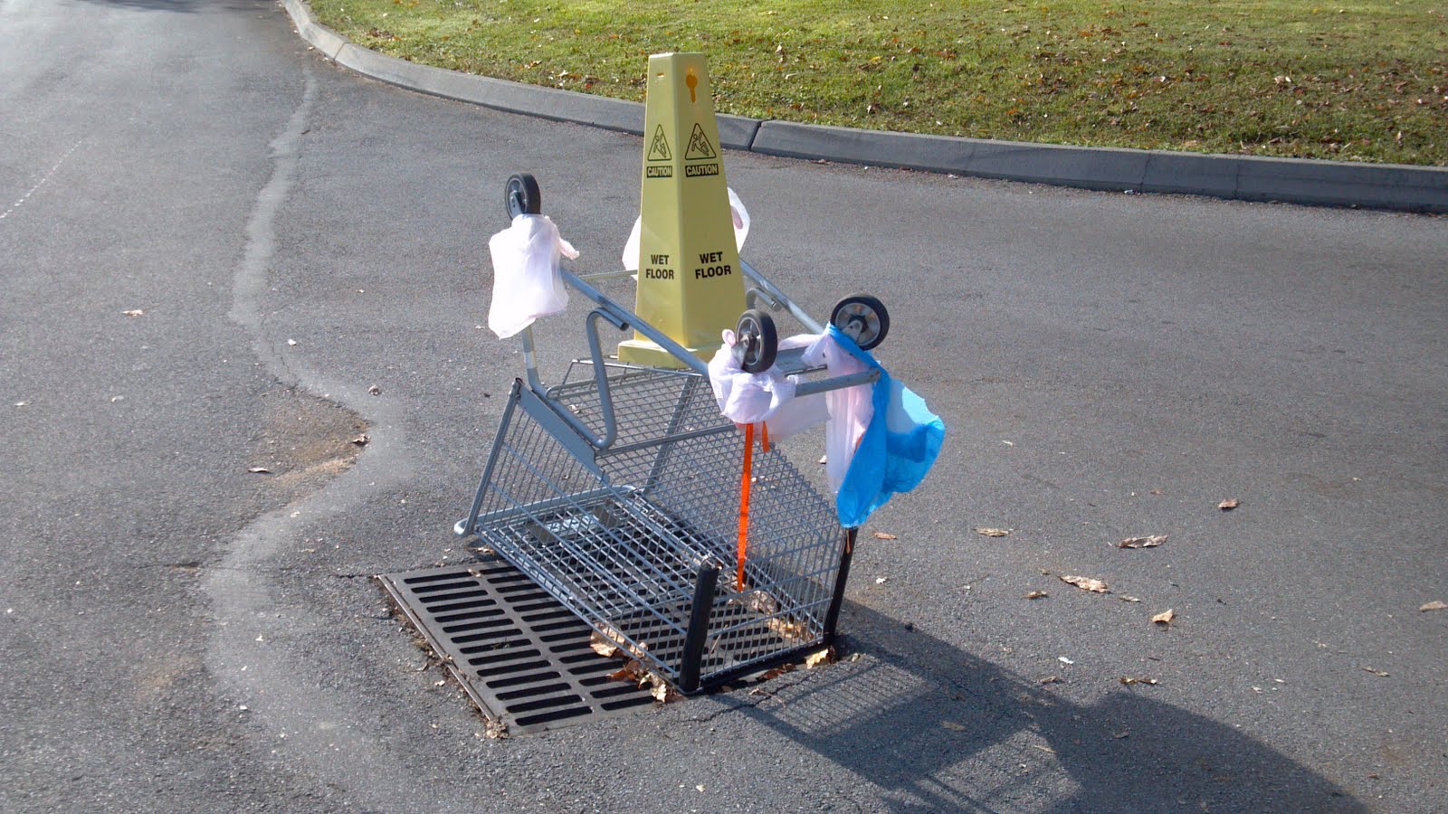 Found this clever pothole cover in east Tennessee. The grate had sunk into the asphalt.