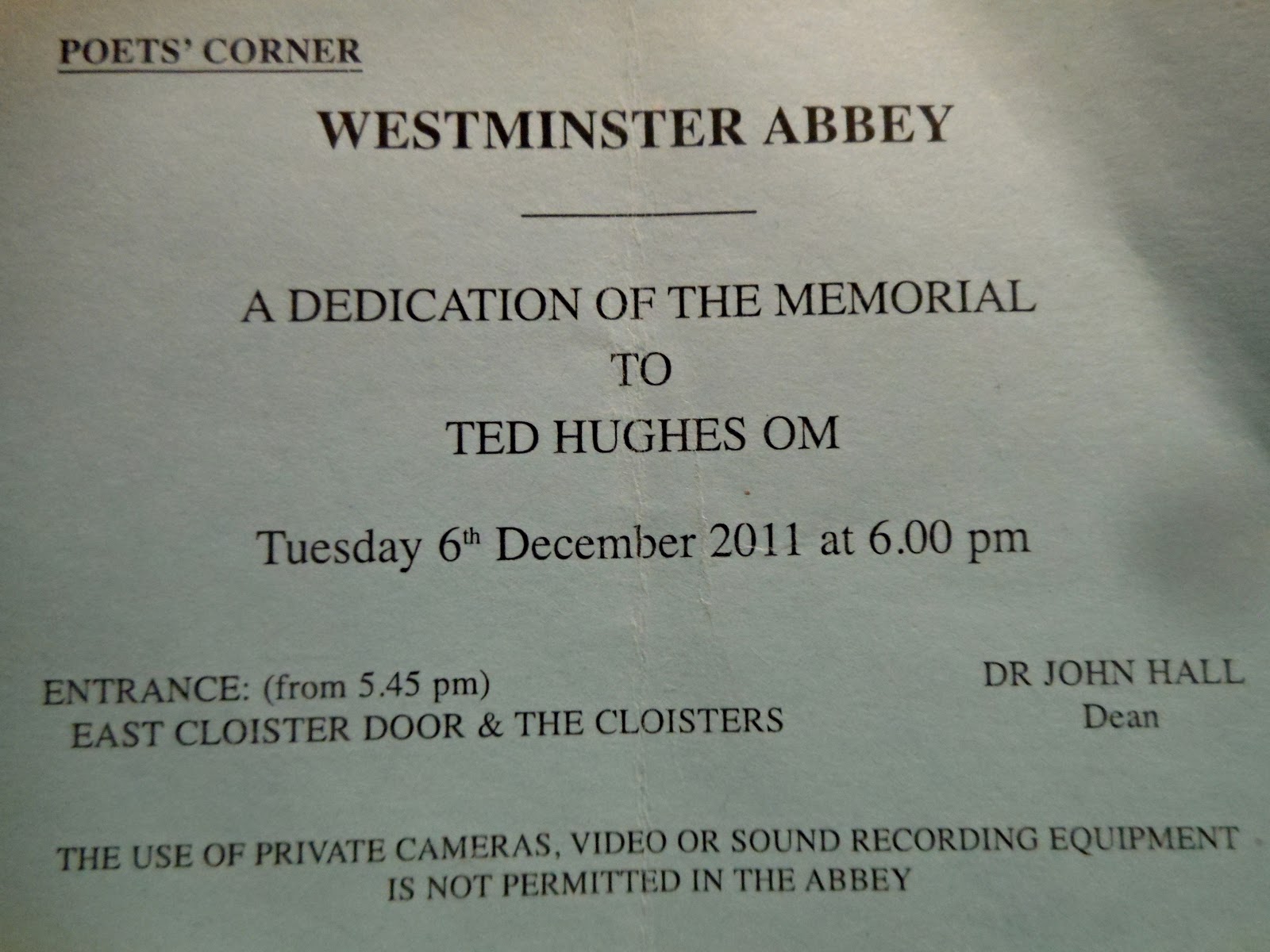 I received an invitation to attend the unveiling ceremony of a memorial stone to Ted Hughes by Seamus Heaney in Westminster Abbey. I set off at 3pm and realised half-way to the station that I had forgotten the invitation card at home so had to go back to pick it up.