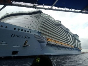 Unlike Australia, where the reef can lie dozens to hundreds of miles from land, Cozumel’s reefs lie right offshore – heck, you could almost swim to them if determined enough. After lunch, my sister and her husband (who’d already done the intro a couple of days before) joined us on the boat out to the reef. We zipped past one of the island’s three cruise terminals, where two Royal Caribbean ships were docked; one of them, the Oasis of the Seas, is the world’s second largest. Passing under it is akin to walking the concrete canyons of New York: a wall of white steel and glass rises up a dozen stories in the sky.