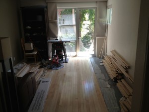 At first my heart sank: I’d wanted to put in 3/4″ thick hardwood flooring, the stuff that’s standard in homes the world over. Normally, to do that over concrete requires an additional plywood subfloor, railway-crosstie-style “sleepers”, or else abandoning real hardwood altogether and going with some cheaper stuff.
