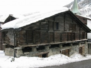 But Zermatt's another story entirely. Humans have been passing through the nearby Theodul Pass for eons. Neolithic tools, Roman coins, and remains of a 16th-century man have all been found nearby. With the advent of Europe's Little Ice Age in the later Middle Ages, however, traffic slowed as the Simplon and Great St. Bernard passes rose in prominence. By the middle of the 19th century, Zermatt was a poor farming village filled with those now-iconic wide-sloped-roof Swiss chalets. I learned why these wood-framed structures (some specimens from way back lay across from my accommodations) sit on stone stilts: used for agricultural storage, they needed to protect themselves from prying mice.