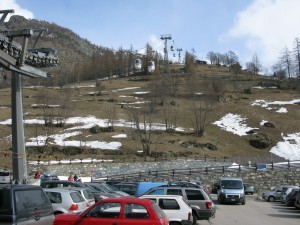 This was the longest descent yet, as Valtournenche lies at an even lower elevation than Zermatt. But I paced myself this time, carefully navigating a couple of traverses and a mini-chairlift to get to the other side of this massive set of mountains. Here again, a narrow trail to the bottom, and, with the low elevation (1,524 m, about the same as Salt Lake City), mushy spring conditions and bare slopes all around us.