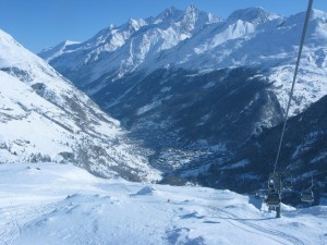 In spite of the late night, I rose on my own steam bright and early for a final day on the slopes. A bit of light snow had fallen the day before, but now skies were blue again, albeit with tendrils of cloud hugging and swirling about the mountains. I again did the gondola/cable car combo to the top of Klein Matterhorn; this time it was windier, colder, and less crowded. As I began my descent, I whooshed into some clouds and it began to snow. The dense fog meant whiteout conditions. But, as with fog back in San Fran, the murk shortly cleared and I opted for another far-flung adventure: taking the pistes all the way down to the other base resort on the Italian side: the town of Valtournenche.