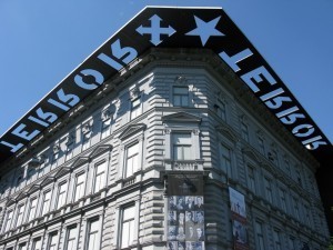 A relaxing meander around City Park then a stroll down leafy Andrássy útca, the city's answer to the Champs-Élysées, proved a worthy tonic to my sinus congestion and sniffles. I wasn't really in a museum mood, but one otherwise-handsome building on the wide, tree-lined boulevard caught my eye: the House of Terror. Its pretty façade is lined by a jutting rooftop metal canopy spelling the words TERROR in mirror-backward writing, so the the sun's rays shine the letters onto the building itself right-side up.