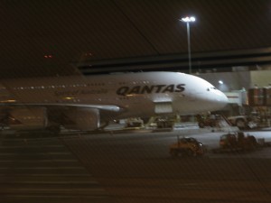 After checking into for my Qantas flight I hoofed it over to the next terminal and availed myself of drinks and nibblies in the cavernous, comfy, and mostly empty lounge space. Through the tall glass-and-steel wall of windows I spotted it: the oddly chunky beast bearing the "QANTAS" logo plastered all over it. This was to be my first time flying the double-decked A380, the largest passenger plane in the world.