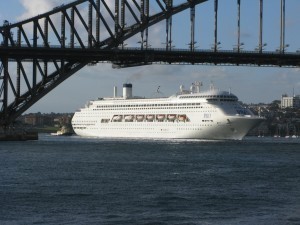 We continued over to the iconic Opera House, adding to my ludicrously bloated stash of photos of the structure; I maintain it's one of the grandest works of modern architecture, and possibly one of humankind's greatest buildings ever (forget it; I'm not adding another picture of it here). Just as we were completing our circuit at Circular Quay's Overseas Passenger Terminal, and right after I asked if the building is still in fact used for such a purpose, my question answered itself: a beefy white vessel sailed under the Harbour Bridge.