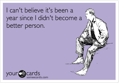 Results - HAHAHAHA. Just kidding. I did good with the exercise, kickboxing 3 times a week...until "The Year of Great Sleep" caught up with me. Then I just couldn't do it any more. I have started walking again though and it feels good. Eat healthier, for the most part. Cut down on wine, yes! Drop weight. I dropped it, then I picked it back up, then I dropped it again, then I picked it back up. I did that a couple times within the 10 pound range. Last time I checked I was down, but I'm pretty sure I've gained during the holidays so I've not checked, and I'm not going to until I fee liked I've dropped a couple pounds. Quiet reflection 30 minutes a day...EPIC FAIL.