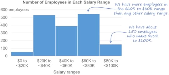 Let’s say that you need to show how the salaries of employees in your organization are distributed and you determine that a histogram is needed. You’re pretty sure, however, that a histogram is going to fly over the heads of some members of your audience. In that case, you could consider adding a few “duh insights” to your histogram to help the audience figure out how to read it:
