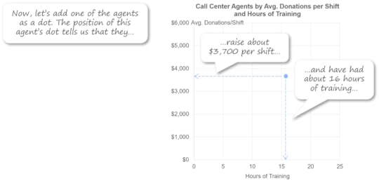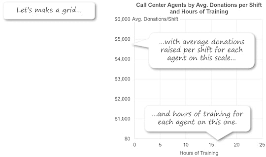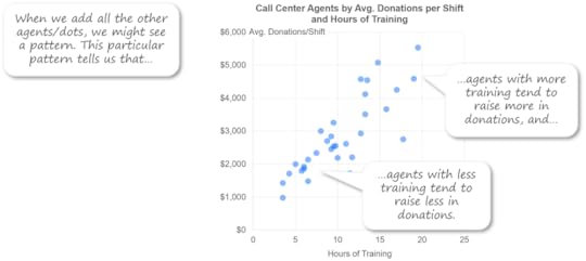 Let’s say that you work for a charity that raises donations over the phone from a call center with 32 call center agents. The management team wants to know if agents who’ve had more hours of training also raise more in donations. You determine that a scatterplot would be an effective way to show that relationship, but you’re pretty sure that some members of the management team don’t know how to read a scatterplot. Instead of showing the unfamiliar chart type (i.e., the scatterplot) all at once, consider revealing parts of the chart in steps: